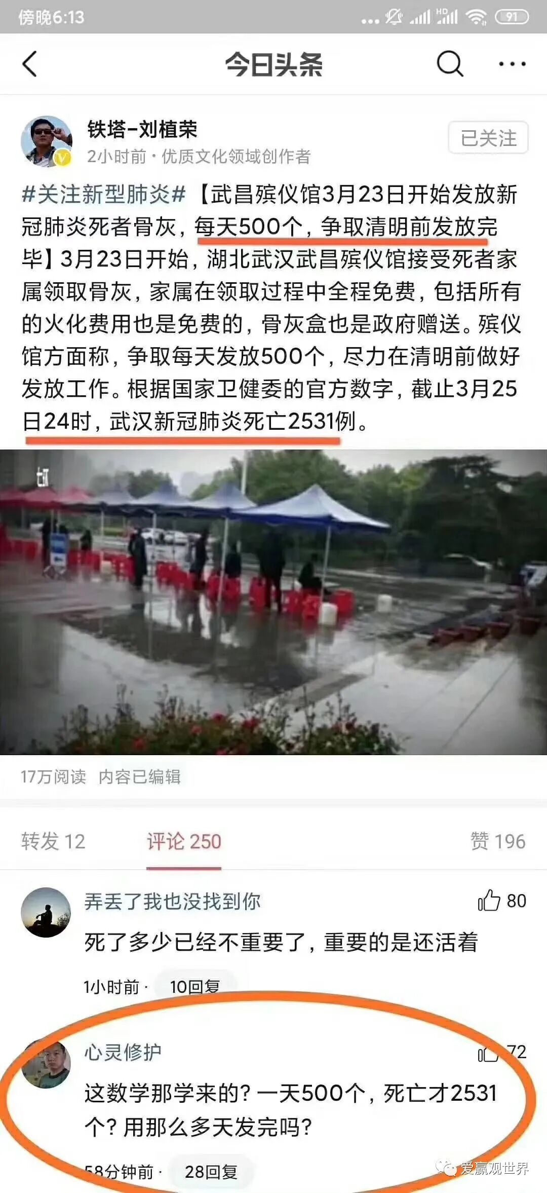 最后,向武汉市和全国所有在册不在册的新冠肺炎死难同胞致哀!向武汉市的医护人员、殡葬工作人员、社区工作者、志愿者致敬!向全国驰援武汉的医护人员、殡葬工作人员、志愿者致敬!愿各种新老病毒、病菌早日与人类和解,愿天下无疫!! PS: 3月31日上午中国驻法大使卢沙野答记者问,称武汉市统计2019年有5.12万人死亡,平均每个月4000多人,而1-2月份因为天气寒冷,死亡人数更多一些,每个月约5000人。今年武汉封城期间两个月积存的骨灰里,有1万人是因其它原因死亡的。卢大使坚称武汉市新冠肺炎死亡2500多人的数字是准确的。如果准确,两个月全市殡仪馆不过火化了12500具遗体,根本就是平时的正常工作量,那殡仪馆员工称2月份每天工作19小时、所有男员工都被安排去搬运尸体,有多支外地殡葬队前来支援的情况下仍然每个人劳动量是平时的三倍,就全是一派胡言了;当初武汉的各大殡仪馆公开向全国求援装尸袋等防护物资,也是寻衅滋事了;汉口殡仪馆此前一年火化8000具遗体,平均每个月火化不到700具,两个月1300多具,现在声称两个月积存了6000多人的骨灰,同样是造谣生事、罪该万死。按照卢大使的说法,武汉完全封城两个月因其它原因死亡1万人、因新冠肺炎死亡2500人,新冠肺炎死亡人数不过是正常死亡人数的四分之一,武汉各殡仪馆的工作量不过比平时增加了四分之一!汉口殡仪馆和武昌殡仪馆都要发放6000多个骨灰盒,正常年份里汉口殡仪馆两个月平均火化1300具遗体,武昌殡仪馆两个月平均火化1200具遗体,6000比1300只大1/4?1300乘以1.25等于6000?! 卢大使的算术题把我们彻底搞晕了。