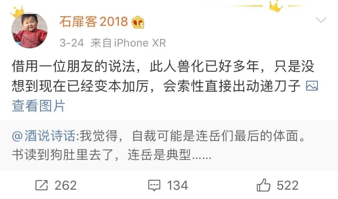 接着,连岳也上了一次热搜,因为他作为一个曾经的著名公知,竟然隐约地批评了方方。他“反水”了。