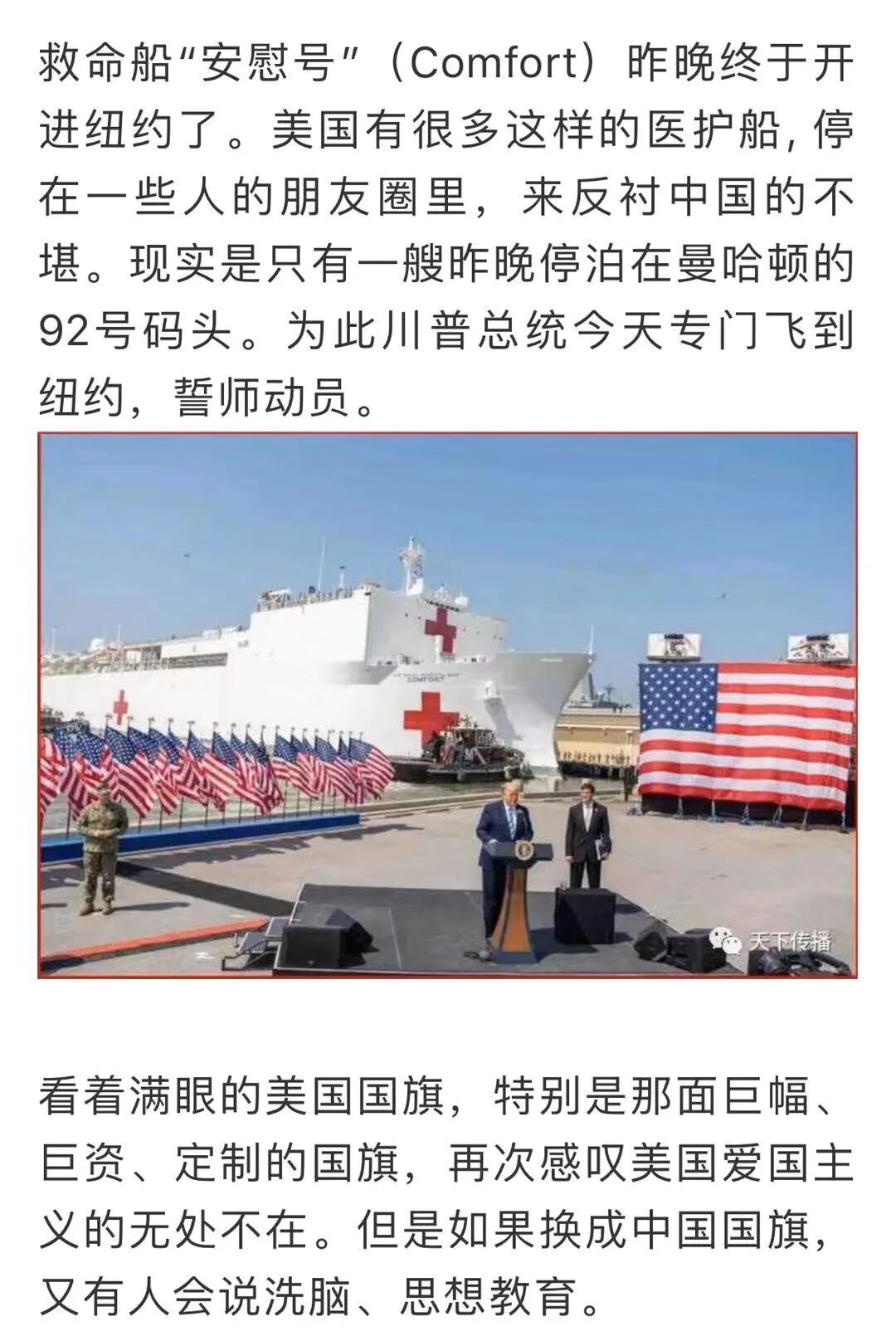 公知说,“美国一夜之间出动35艘医疗船,搭建216座方舱医院。”
