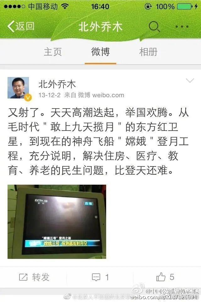 2013年,我国“嫦娥三号”探测器发射升空,乔木在微博喷了一波——民生问题都解决不了,发展什么航天工程。