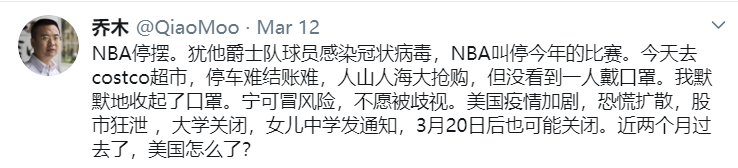 在美国NBA停摆、股市狂泻、大学关闭后,乔木惊呼,“美国怎么了?”